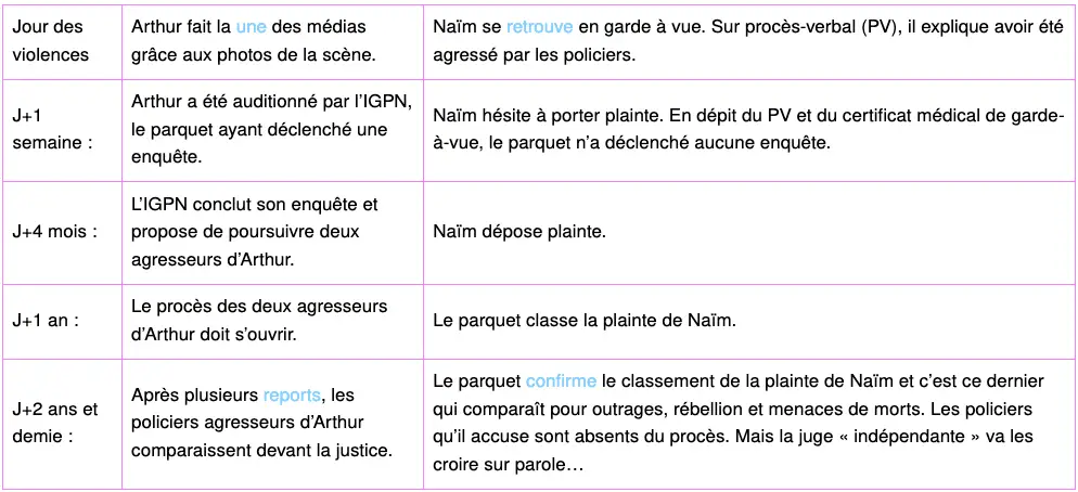 La justice lyonnaise a le sens du symbole. En deux jours coup sur coup les 24 et 25 novembre derniers, elle a rendu ses jugements dans deux affaires de violences policières. Procès de la BAC de Lyon : les deux fonctionnaires agresseurs d’Arthur Naciri sont condamnés à 12 mois de prison avec sursis. Les faits avaient eu lieu en décembre 2019, place Bellecour en plein centre ville. Le lendemain, procès de Naïm : il se retrouve condamné pour rébellion et menaces de mort sur les policiers qu’il a pointés comme ses agresseurs. Et ce en dépit des certificats médicaux attestant qu’il a subi des violences. Jugement : 600€ d’amende + 1000€ à verser aux policiers. Les faits avaient eu lieu en janvier 2020… à Vaulx-en-Velin. La juge ne relaxe Naïm que sur les faits d’outrage, reconnaissant implicitement les contradictions des policiers.
