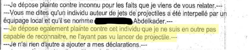 A la fin de cette première audition, Abdelkader réaffirme avoir reçu un coup et précise se souvenir de la tête du policier, qu’il décrira comme « chauve » dans une future audition.