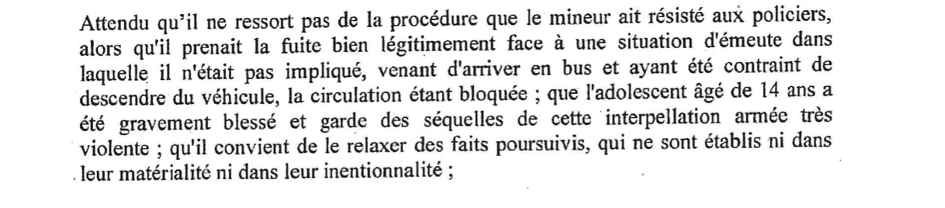 Abdelkader est déféré devant le juge des enfants, le même jour. Il est mis en examen et placé en liberté surveillée jusqu’à sa relaxe, plus d’un an après, le 12 octobre 2021. La juge des enfants motive sa décision en termes explicites :