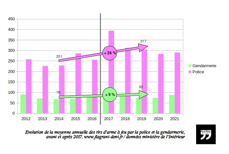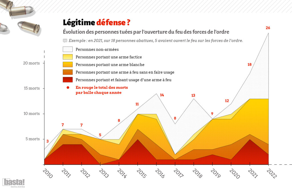 L’actualisation de la base de données de Basta.media sur les morts suite à une action de la police rappelle que depuis la loi de 2017, les décès par des tirs de policiers ou gendarmes ont massivement augmenté. Entre 2016 et 2022, ils ont été multipliés par deux !